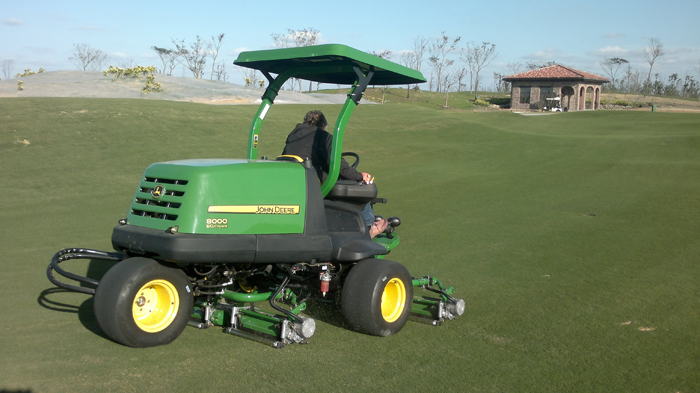 為打造頂級錦標賽事球場,從設計建造至今,覽海國際高爾夫俱樂部配備了綠友提供的草坪養(yǎng)護設備,一應俱全。高端上檔次的配置,為日后草坪的養(yǎng)護提供了堅強的保障,其中美國迪爾公司的8000E混合動力坐騎式五聯(lián)球道剪草機就成了其中的一大“功臣”。18英寸QA5刀組,兼?zhèn)湎冗M的油電混合技術,起早摸黑,征服了連綿起伏的球道,贏得了俱樂部草坪總監(jiān)及其團隊的一致肯定。馳騁美巡,盼其再續(xù)輝煌征程。