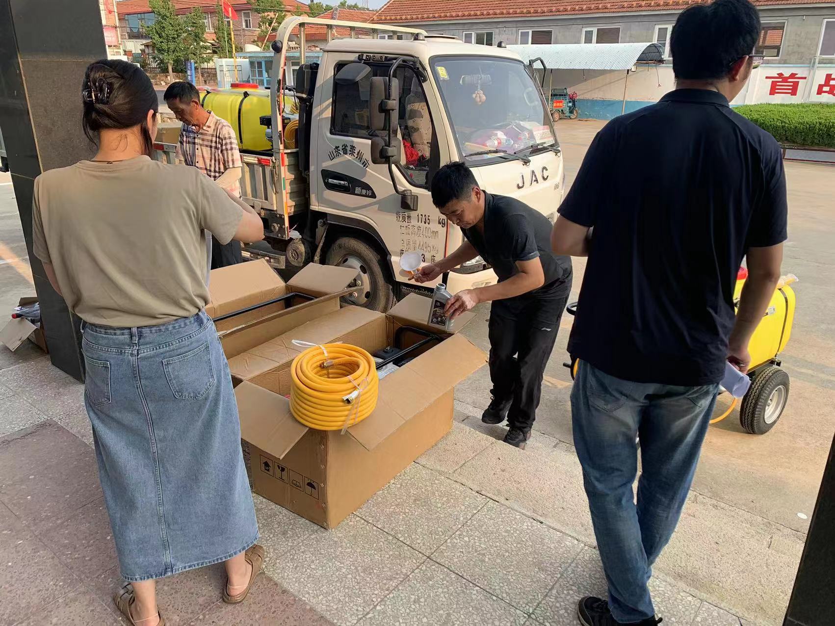 工具到貨,為盡快完成供貨,濰坊綠友的同事們一件件、一箱箱卸到庫房,根據(jù)每個(gè)鎮(zhèn)的需求,按型號(hào)按數(shù)量分裝、核對(duì),為打藥機(jī)加注機(jī)油以便客戶使用。汗水模糊視線、打濕衣襟,卻毫不影響同事們的工作勁頭。