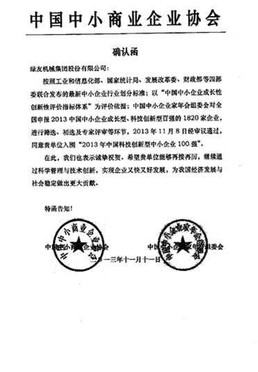 綠友榮獲“2013年中國科技創(chuàng)新型中小企業(yè)100強” 確認函: