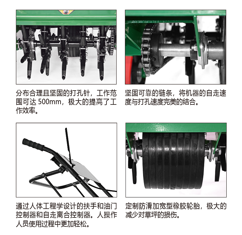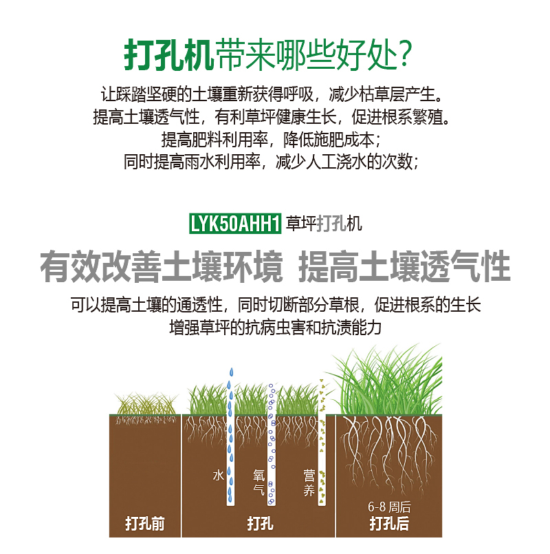 打孔可以切斷部分草根,促進(jìn)根系的生長(zhǎng),增強(qiáng)草坪的抗病蟲(chóng)害和抗?jié)n能力。