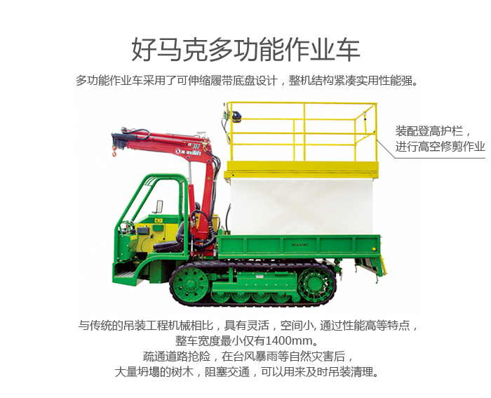 多功能作業(yè)車采用了可伸縮履帶底盤設(shè)計(jì),整機(jī)結(jié)構(gòu)緊湊實(shí)用性能強(qiáng)。與傳統(tǒng)的吊裝工程機(jī)械相比,具有靈活、空間小、通過性能高等特點(diǎn),整車寬度最小僅有1400mm。同時(shí),履帶式底盤對(duì)地面的要求也很低,不用考慮地基的要求。